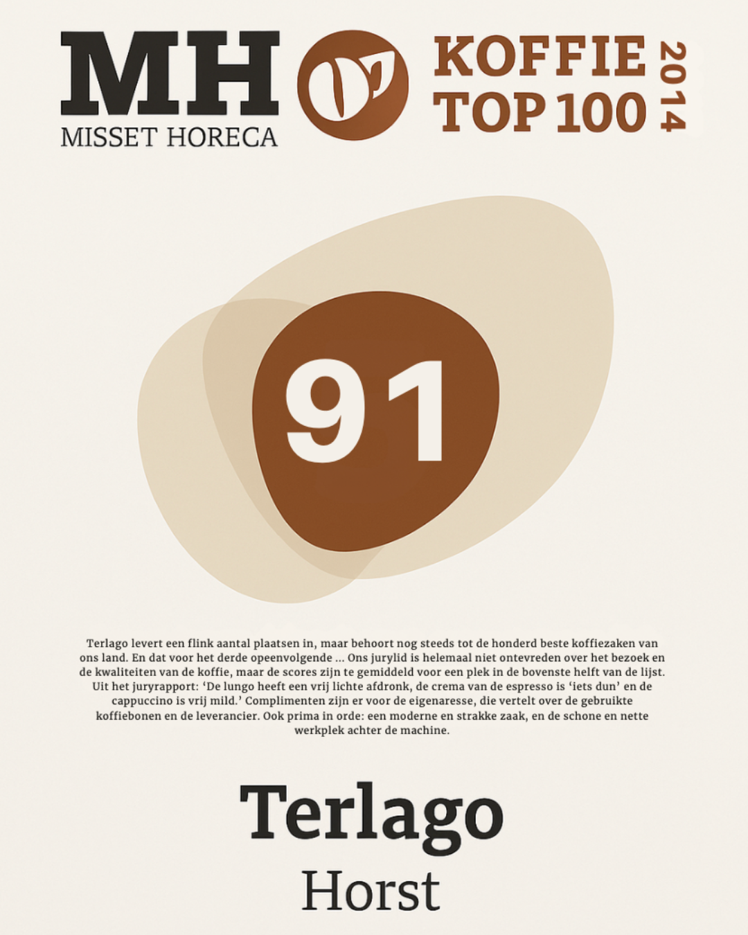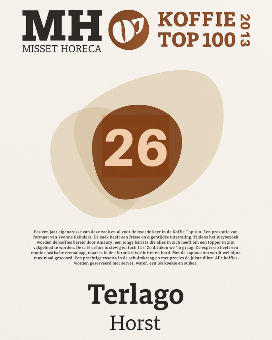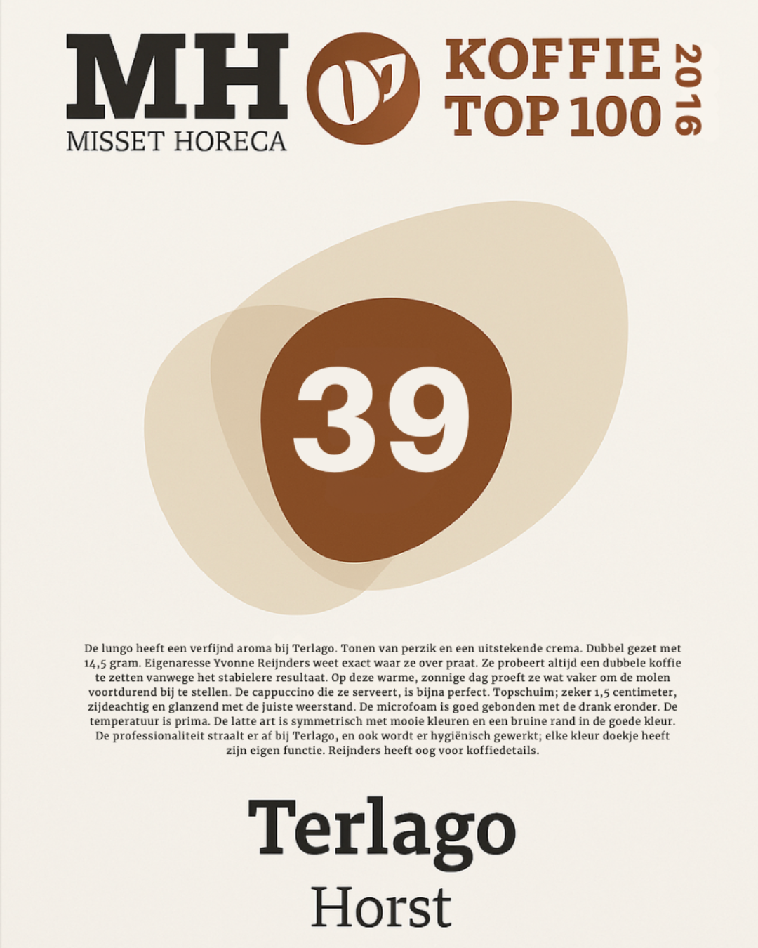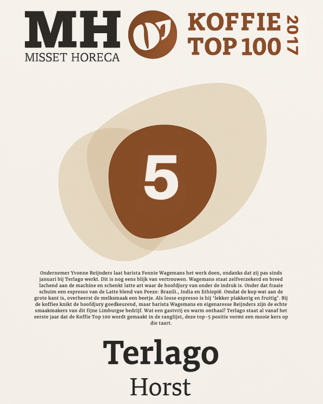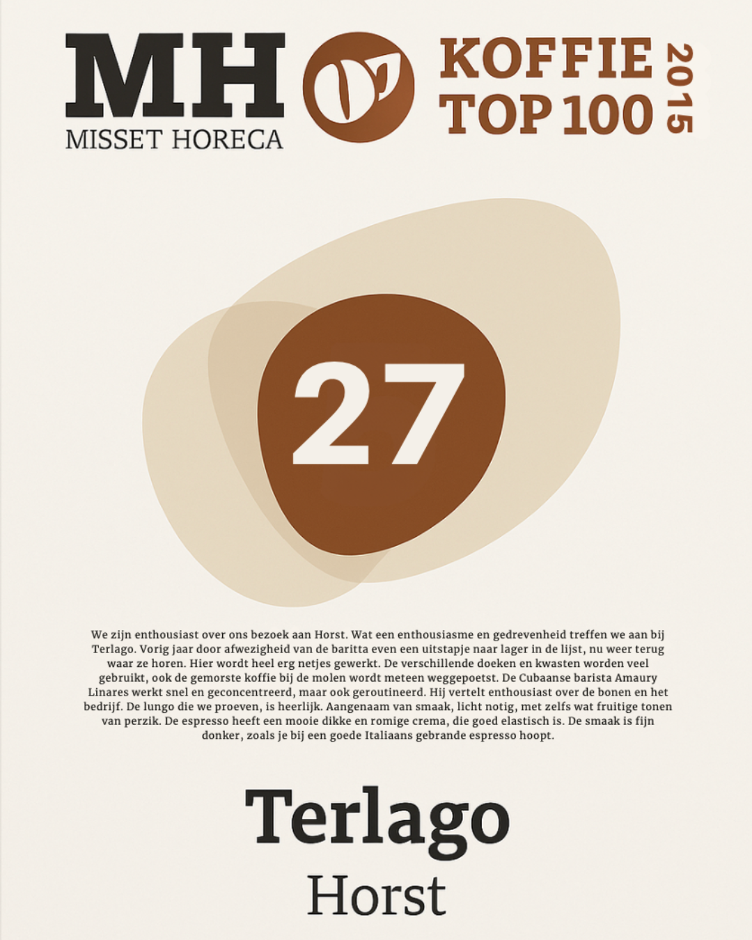 Van 2013 tot 2017 stond Terlago onafgebroken tussen de beste koffiezaken van het land. De jury prees onze professionaliteit, het vakmanschap achter de espressomachine en de constante verfijning in smaak en presentatie.
